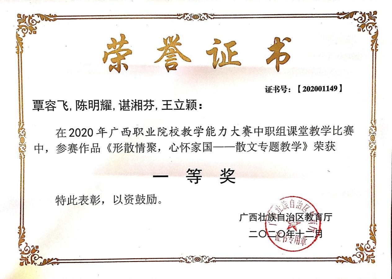 覃容飞、陈明耀、谌湘芬、王立颖参加2020年全区教学比赛自治区级一等奖